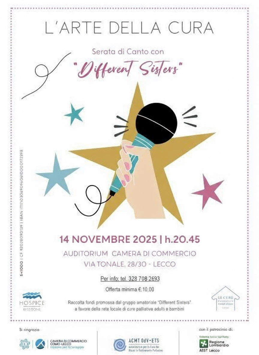 Serata di canto promossa dal gruppo amatoriale “Different Sisters” a favore della rete locale di cure palliative per adulti e bambini. Vi aspettiamo presso l’Auditorium della Camera di Commercio di Lecco in via Tonale 28/30 il 14 novembre alle ore 20.45. E’ gradita la prenotazione (cel. 3287082693)